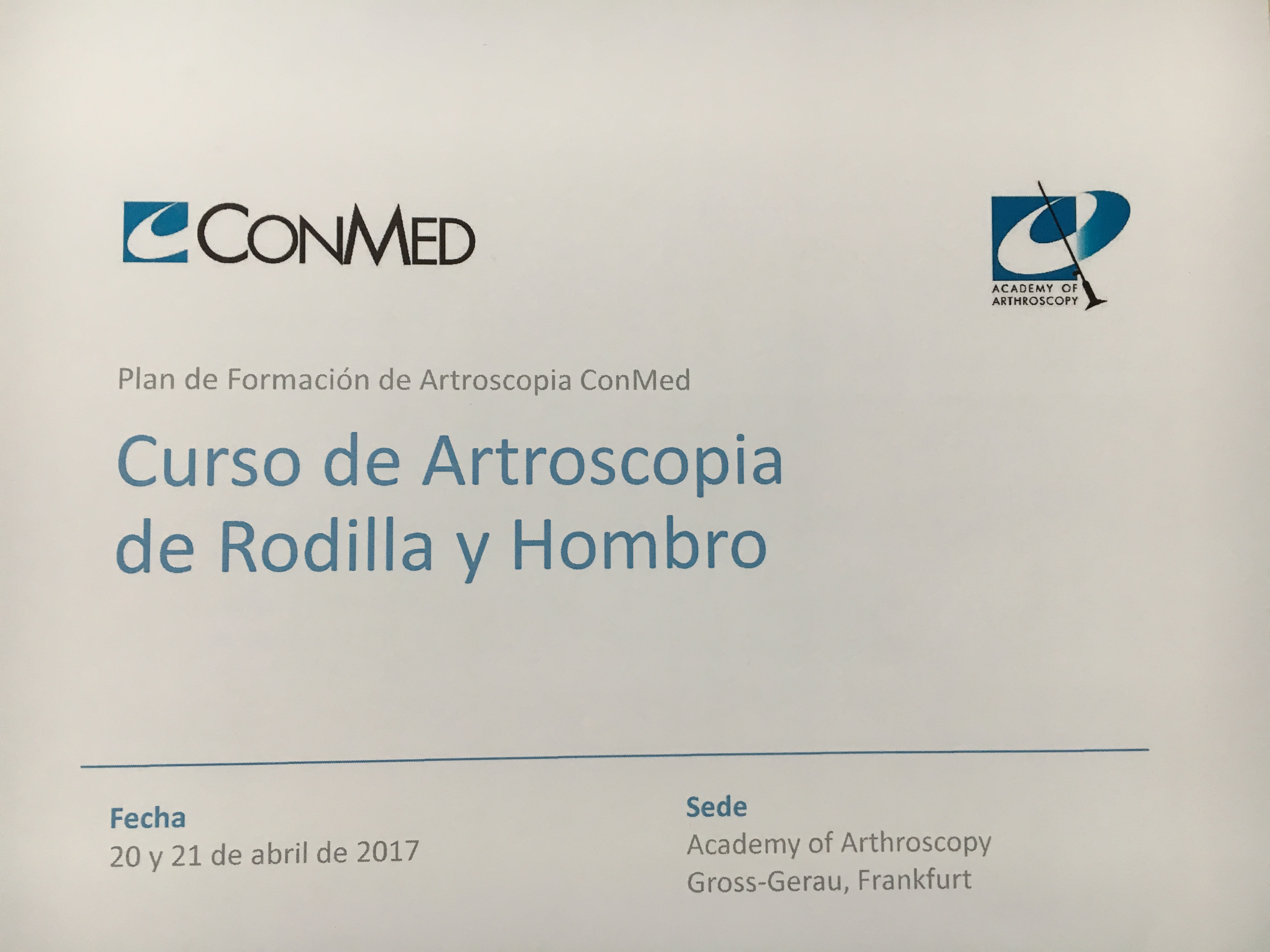 El passat 20 i 21 d ‘abril vàrem dirigir el Curs Avançat d’ Artroscòpia de Genoll (Dr. Pelfort) i espatlla (Dr. Escudero) a les instal·lacions de Conmed a Mainz (Alemanya).